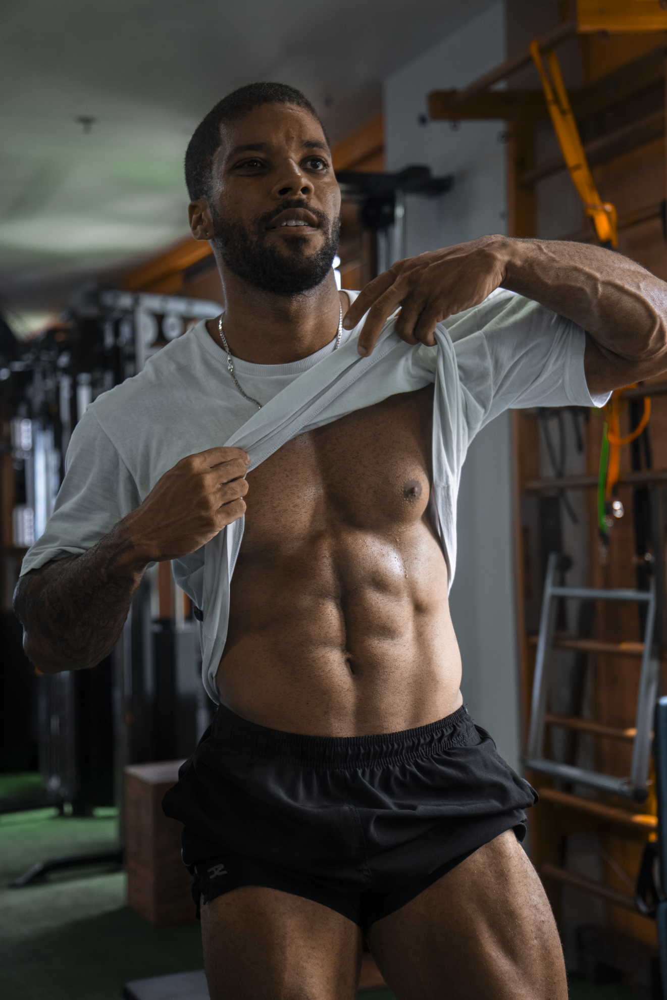 - Abdômen visível, cintura mais fina, veias aparecendo